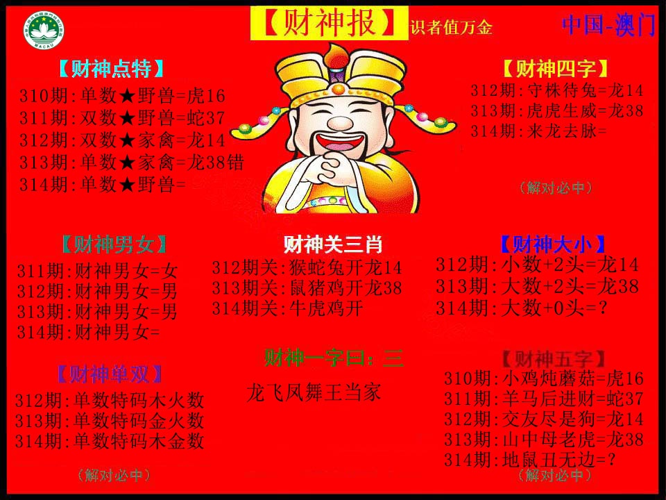| 314期必中二肖:鼠龙 | 314期必中③码:18.30.14 |