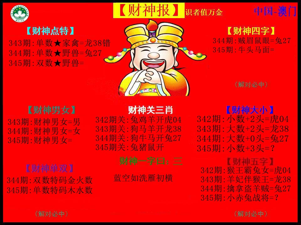| 343期: 买啥都中 【野肖野肖野肖】开:龙38准 |